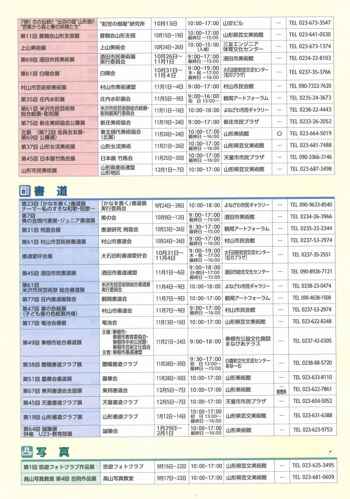 | 2.共催及び後援事業 | (1) 第56回芭蕉忌俳句大会 10月26日(日)山寺芭蕉記念館 (3) 齋藤茂吉文化賞受賞・教育功労者表彰・地域文化功労者表彰を讃える会 共催:山形市芸術文化協会 (4) 会員の申請による後援事業 会員が主催する事業を原則として後援