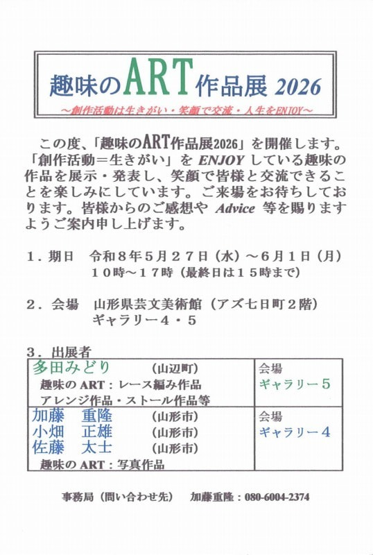 日頃から写真撮影や手芸作品づくりを趣味としている仲間による作品展です。趣味のART作品を発表し、ご覧いただきました皆様からのご感想などを拝聴しながら笑顔で交流できますことを楽しみにしております。